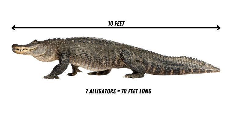 7 full grown alligators that are 10 feet in length can be used as a reference for something that is 70 feet long.