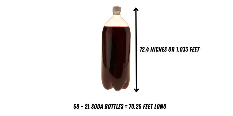So to be more precise, if you had 68 of these 2 liter soda bottles and lined them up in a row, they would equal 843.2 inches or just over 70 feet in length.