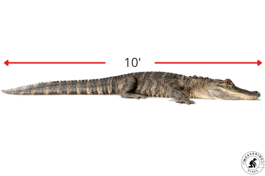A fully grown adult alligator will vary in length from 10 to 14 feet long.