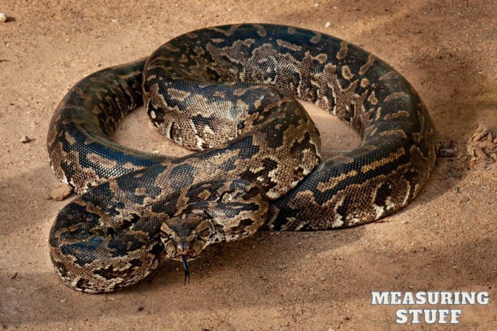 African rock pythons have thick, muscular bodies, and their scales are dark brown with a pattern of yellow or olive-green splotches.