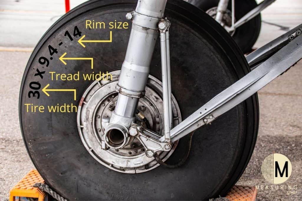 For example, a Boeing 737 airliner has a tire size of 27 x 7.5R 15 which means it is 27 inches in diameter, 7.5 inches wide, and fits on a 15 inch rim.
