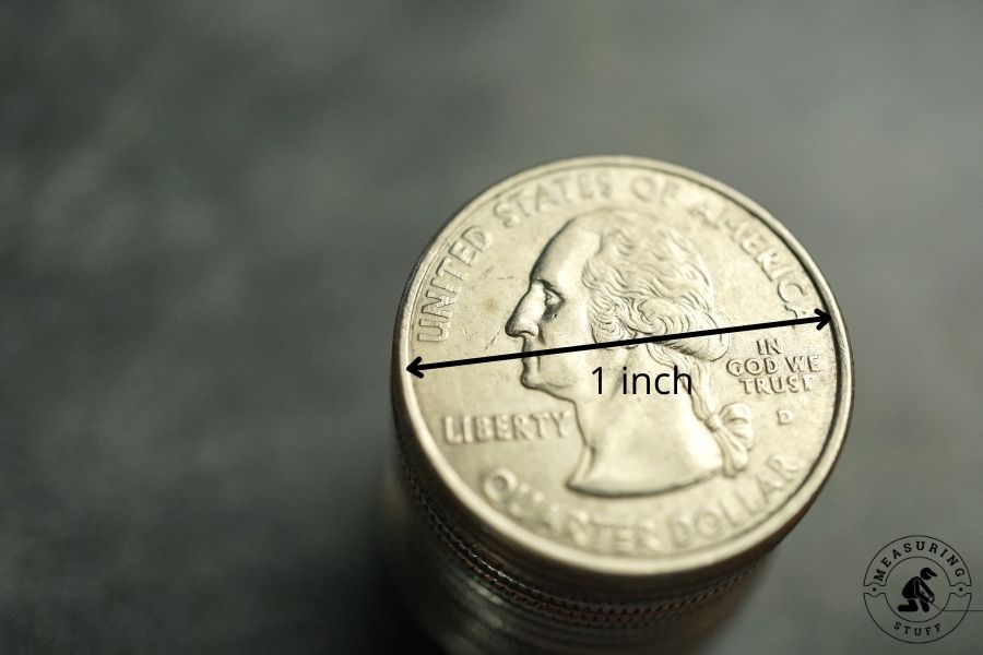• A quarter in the USA is 0.955 inches in diameter (You may want to round up to 1 inch for an estimate)
