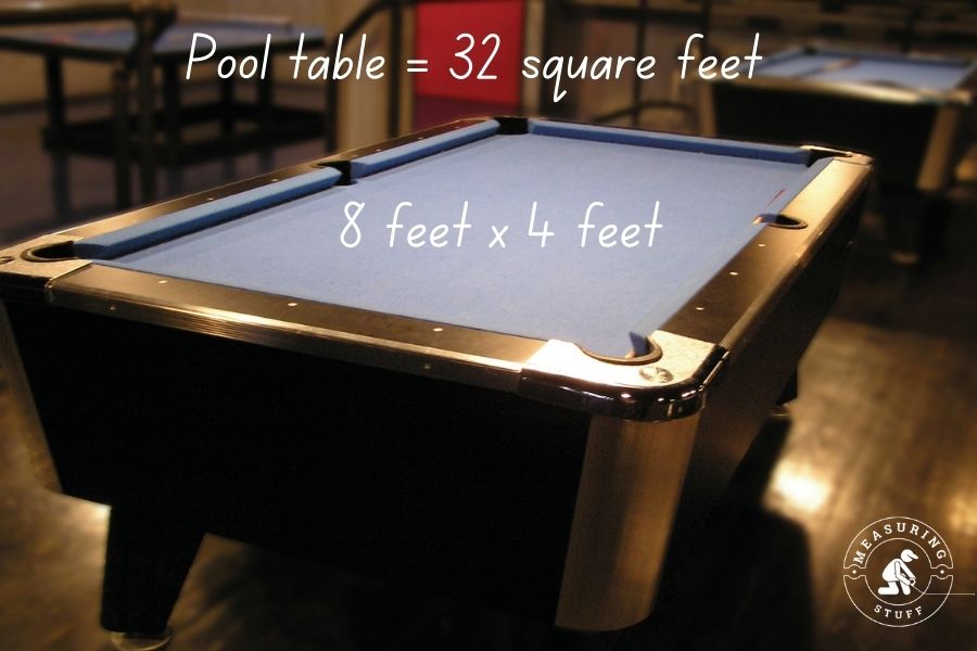 Pool tables can be found in a few sizes, but the medium size is 8 feet long and 4 feet wide, which equals 32 square feet. This is just smaller than an average bathroom.