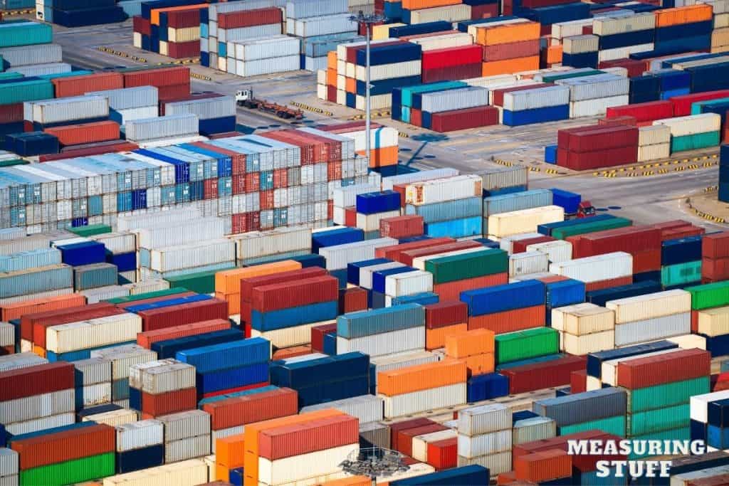 Shipping containers can be different sizes with the most common one being 40 feet long and 8 feet wide. These containers are 320 square feet in size or 0.007 acres. 1361 of these shipping containers would equal around 10 acres.