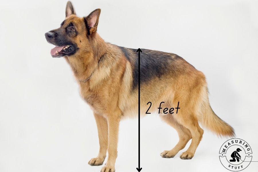 On average, an adult German Shepherd will stand 2 feet or 24 inches tall.