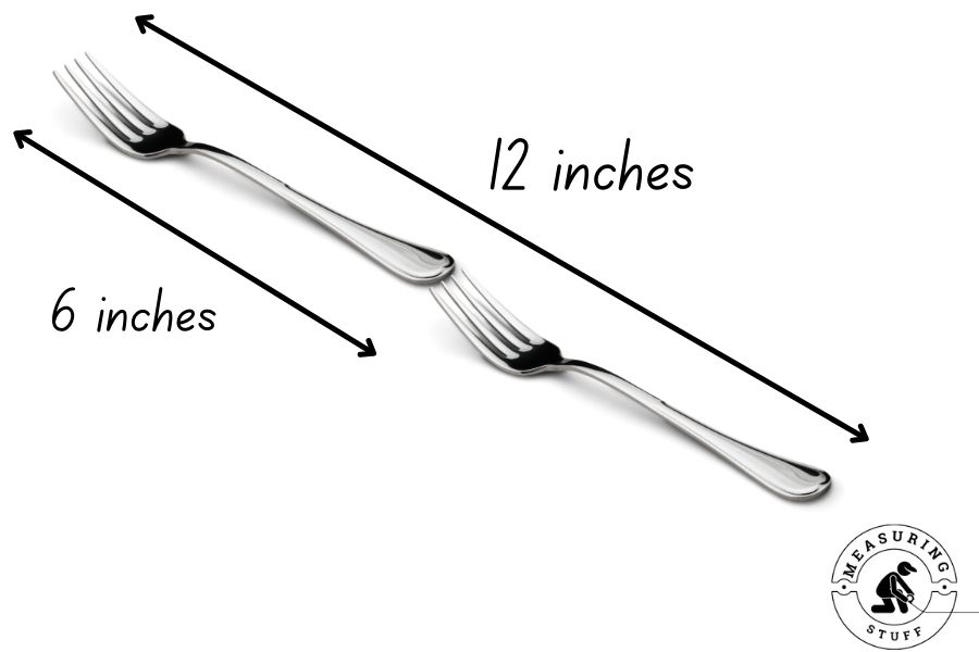 Many salad forks are 6 inches long, so if you put 2 of these forks together, they will equal 12 inches or 1 foot long.