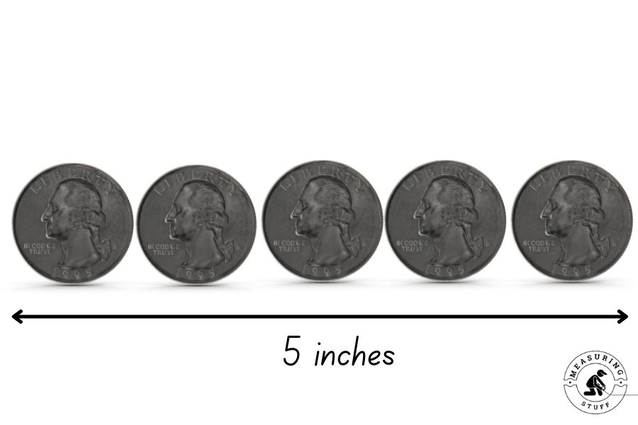 For example, a United States quarter is exactly 1 inch in diameter. This means that it’s 1/5 of 5 inches. If you line up five quarters, you’ll have a length of exactly 5 inches.