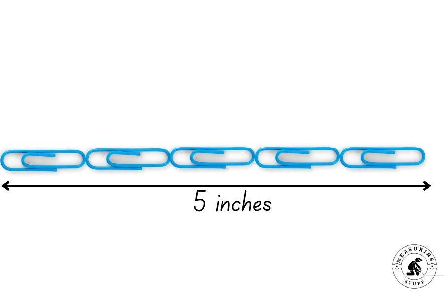 Medium paper clips are usually about, if not exactly, 1 inch long, making them 1/5 as long as 5 inches. If you can visualize a paper clip, or if you have a paper clip handy, you can use it to accurately estimate 5 inches either by knowing that it’s about 1/5 of the length or by lining up 5 paper clips, which will bring you to right around 5 inches.