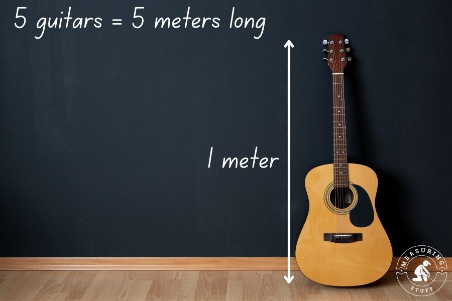 Therefore if you had 5 guitars placed together in a row, they would equal 5 meters long and be a good example of something that measures 5 meters in length.
