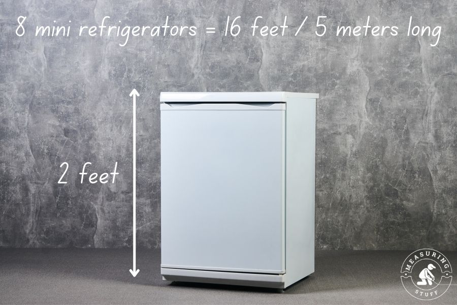 If you can picture 8 mini refrigerators placed together in a row, they would equal 16 feet long which is just short of being 5 meters long.