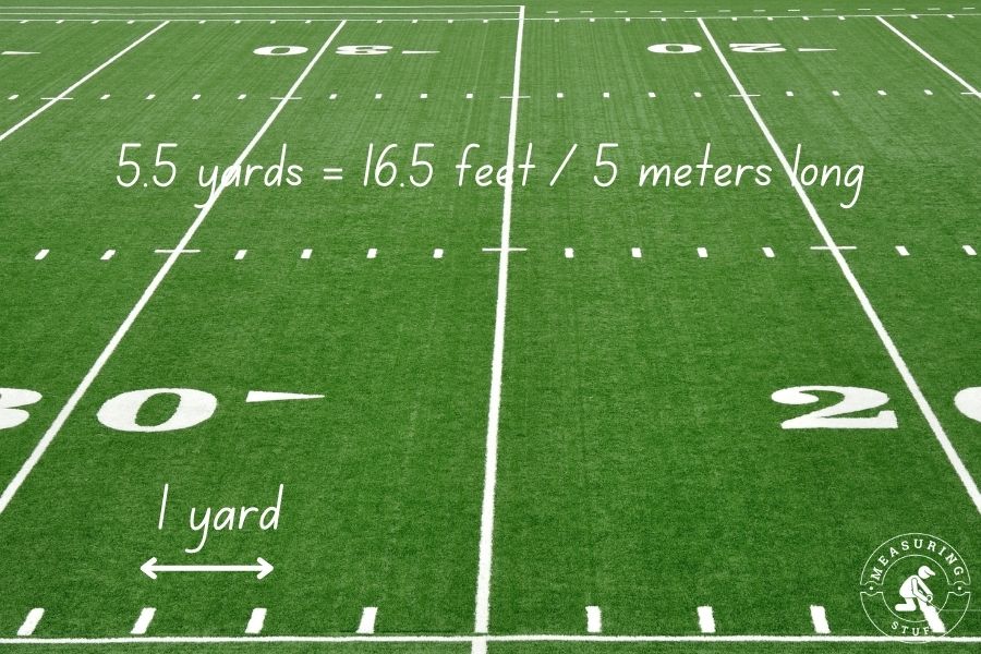 If you measure the distance between yard lines which is 1 yard or 0.91 meters, you would need 5.5 yards to equal the length of 5 meters long.