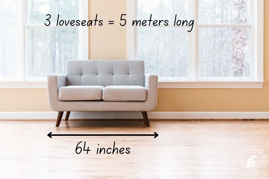 As a large loveseat is 64 inches or just over 5 feet long each, placing 3 loveseats together in a row would equal close to 16 feet long which is close to 5 meters long.