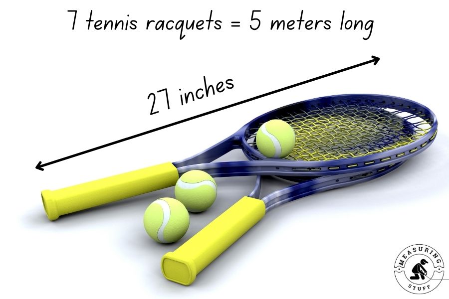 Most adult tennis racquets are 27 inches long which is 3 inches longer than 2 feet. One racquet is 0.68 meters long and therefore 7 tennis racquets will equal 189 inches or 4.8 meters long which is just short of measuring 5 meters in length.