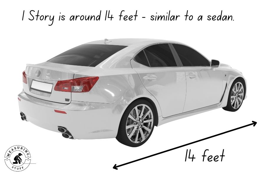 An average sedan-style car is about 14 feet long, so looking at your car can help you easily visualize the height of a story.