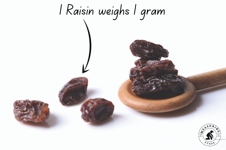 Each raisin will weigh a bit differently, as grapes grow to different sizes and the drying process will have variable results, but in general, the weight of 1 gram per raisin is relatively accurate.