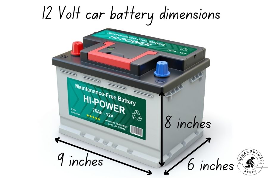 Although not all 12-volt batteries are the same size, on average they have the dimensions of 9-10 inches long x 8-9 inches high x 5-7 inches wide. For example, the 2020 Honda Civic uses a group size 51R battery that has the exact dimensions of 9.3 inches long by 5.1 inches wide by 8.9 inches high.