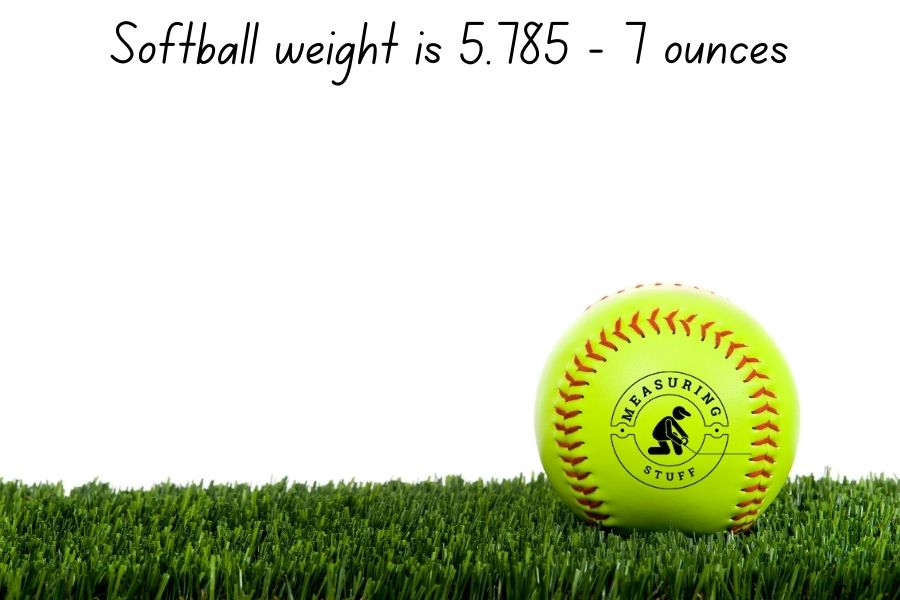 An 11-inch softball weighs between 5.785 ounces and 6.125 ounces.