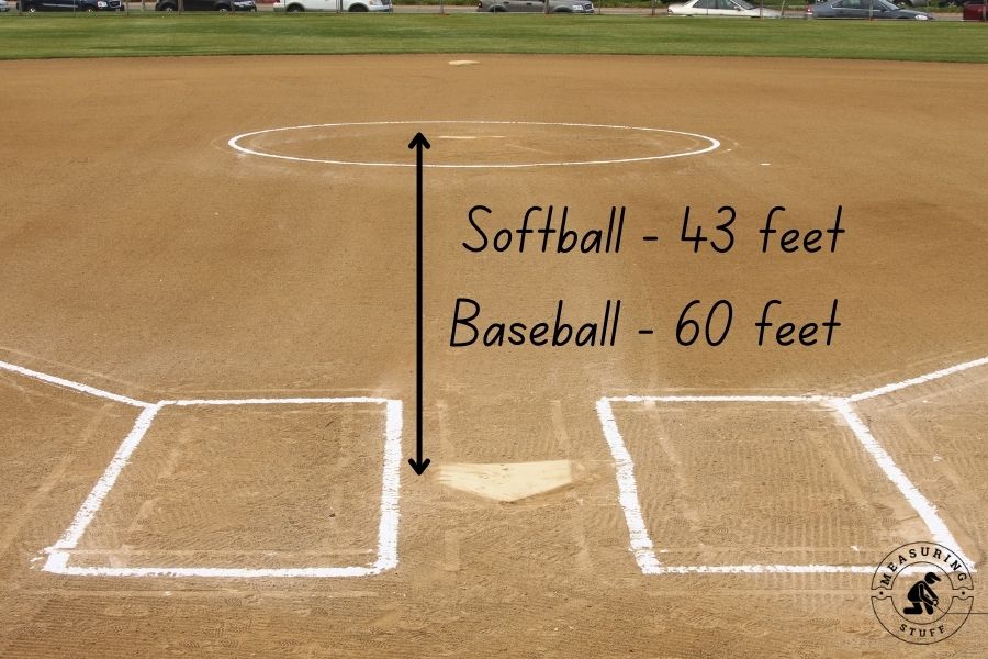 For example, the distance from the pitcher’s mound to home plate in softball is 43 feet. In baseball, it is 60 feet.