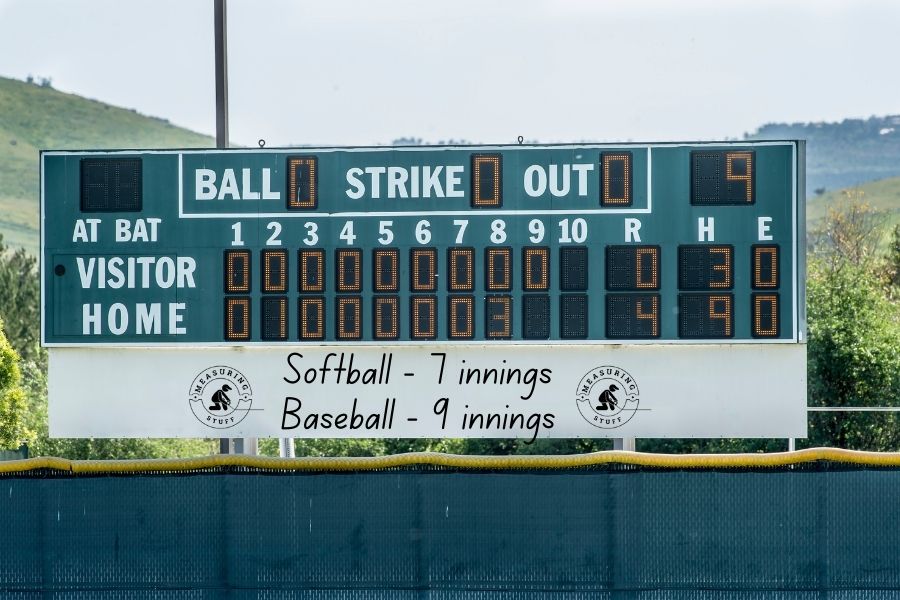 A regulation softball game is 7 innings long and baseball is 9 innings.