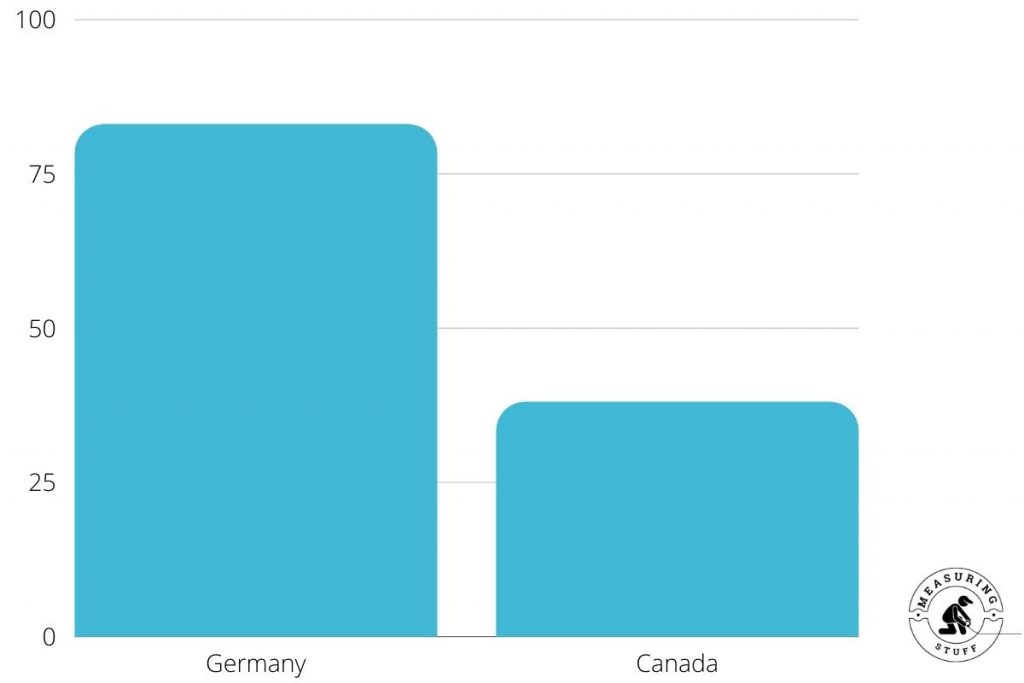 Although Canada has a larger land area than Germany, Germany has a much higher population. As of 2019, Germany was home to about 83.02 million people, while Canada had a population of about 37.59 million people.
