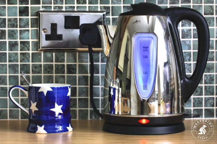 A normal-sized electrical kettle that holds 1.7 liters of water weighs around 2 pounds when empty.