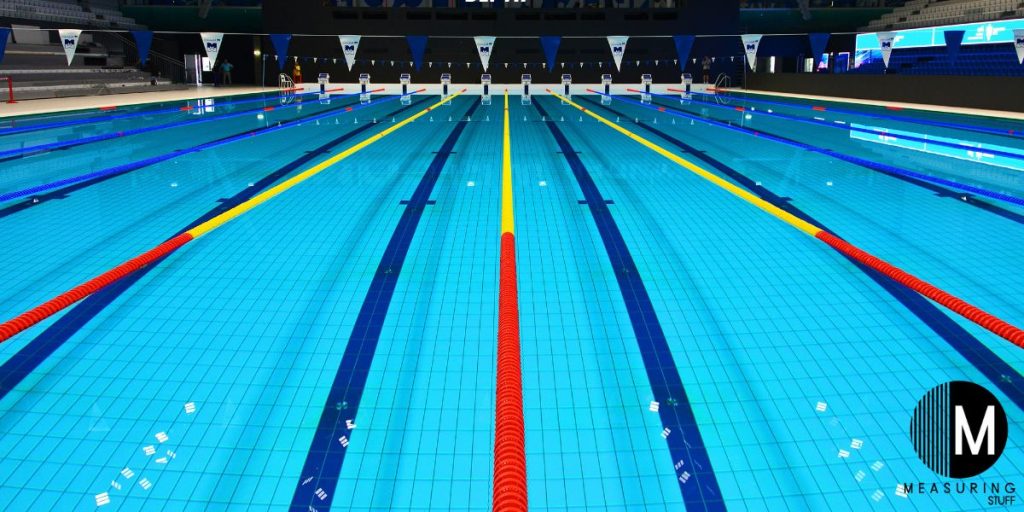 These pools are a standard length of 50 meters and are referred to as the long course. The other size often used during the Olympic games has a width of 25 meters and is referred to as the short course.