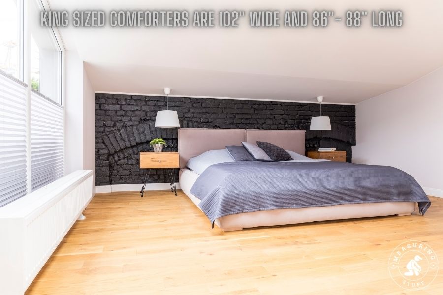 King comforters are usually 102 inches wide and between 86 and 88 inches long.