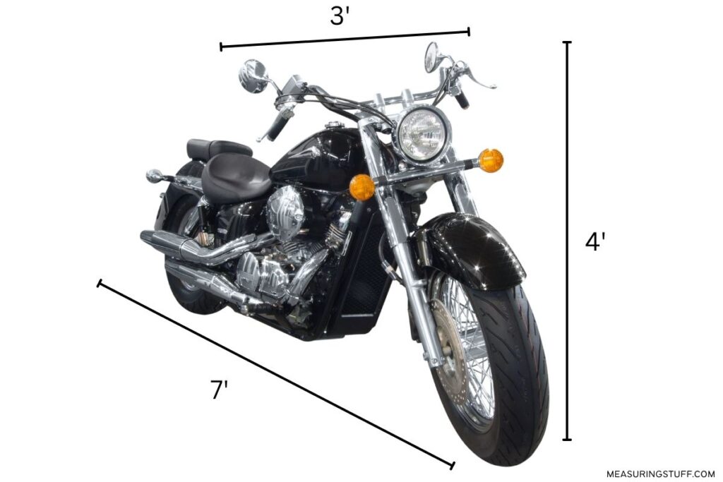 The average motorcycle measures about 7’ x 3’ x 4’. Common dimensions for motorcycles include: